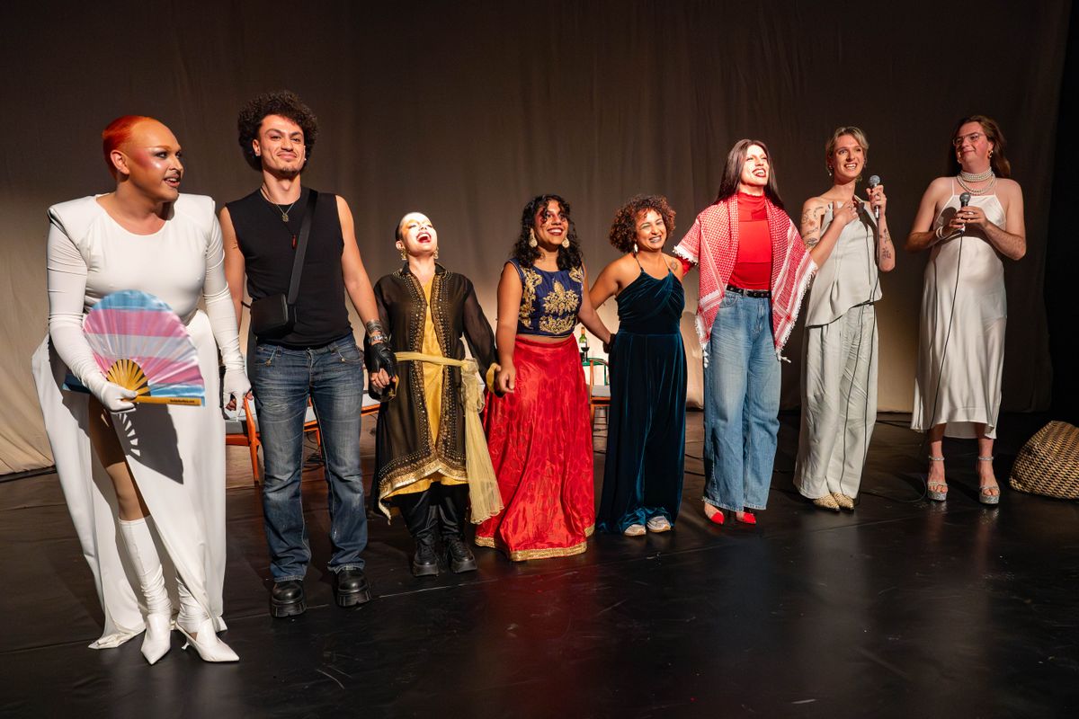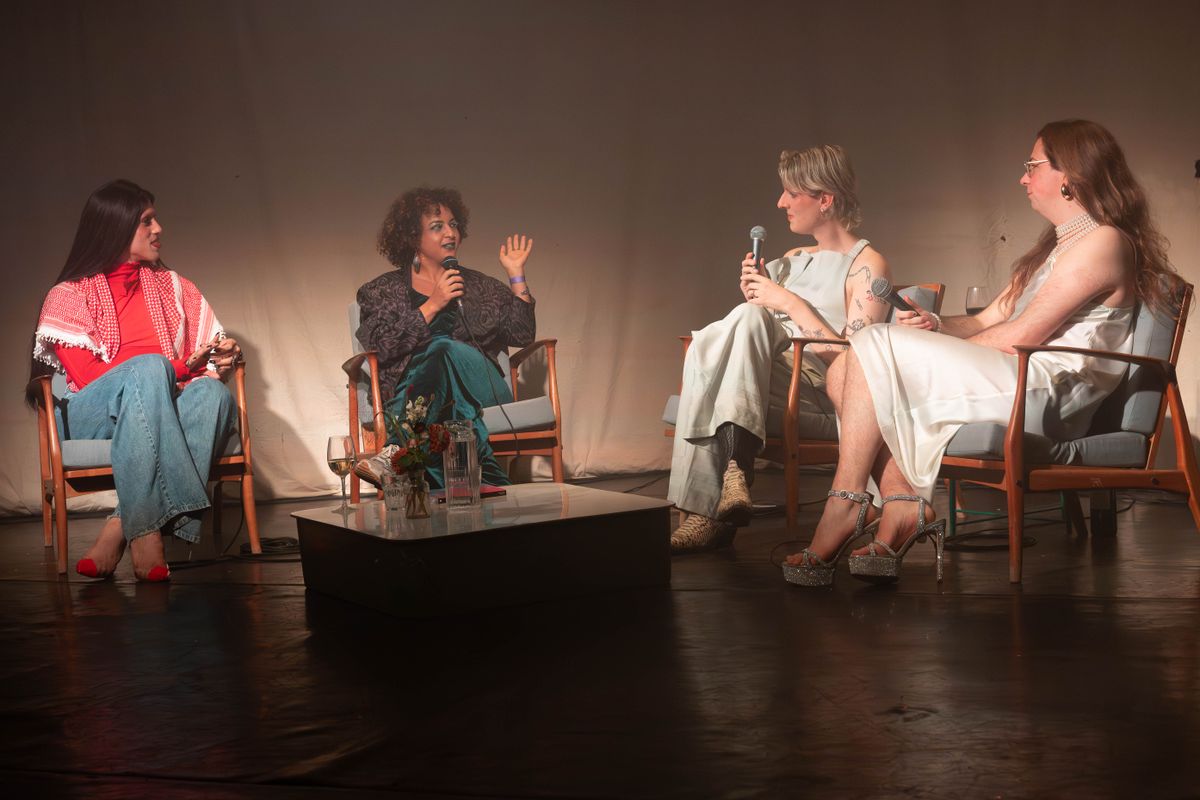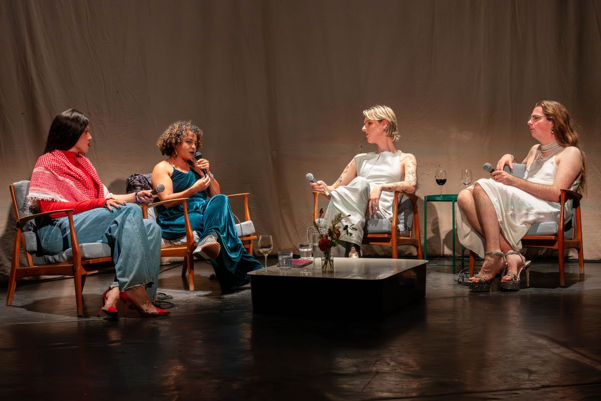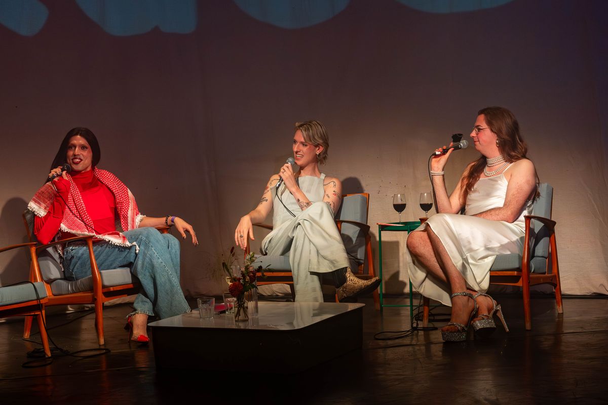 Meer dan een paar spots, vier mooie zeteltjes en even veel microfoons waren niet nodig om het podium van Antigone te verbouwen tot de set van een talkshow. We waanden ons Ellen De Genderless en Gender Verhulst, voor minstens één avond uw hosts van een mogelijke toekomst. We gingen als bakvissen met elkaar op speeddate en verwelkomden met open armen en volle glazen onze gasten op het podium. De oprechte en broze gesprekken met Hausvrau en Oumaima werden afgewisseld door artistieke interventies die niemand onberoerd lieten.
