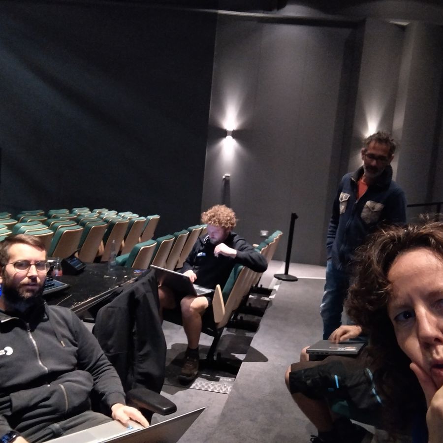 Overleg met Frederik van CC het SPOOR tijdens spacing en richten van de laatste lampen voor de NEXTvoorstelling 'Gentle Unicorn' van straks.