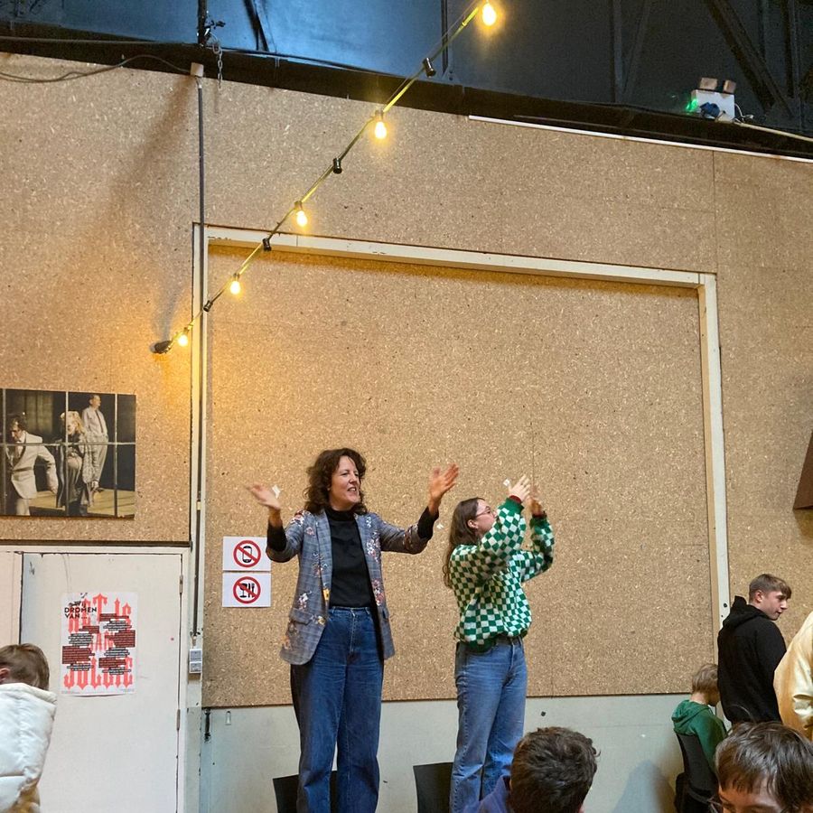 Alle leerlingen zijn toegekomen. Nog snel een introductiepraatje samen met Clara van Antigone.
