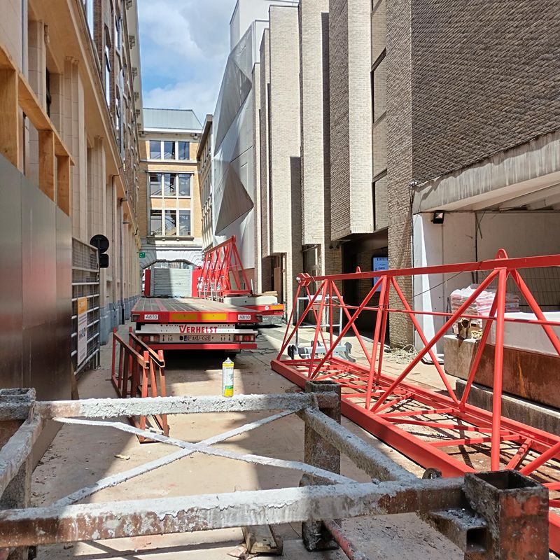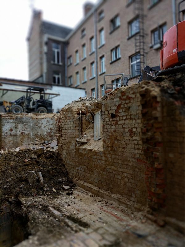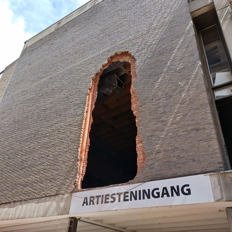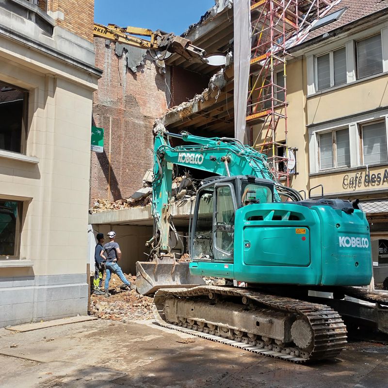 De afbraak is intussen in gang gezet: aan de ‘coté cour’ (kant Doorniksestraat) is de conciërgerie al afgebroken. Er wordt volop voorbereid om het uitgraven van de kelder op een veilige en efficiënte manier te laten verlopen. Nu de torenkraan geïnstalleerd is, wordt eerstdaags ook de ‘coté jardin’ gesloopt (kant Arenatheater en foyer). Zo worden de oude zijgevels van de Schouwburg terug aan twee kanten ontbloot, zoals net na de opening in 1920.
