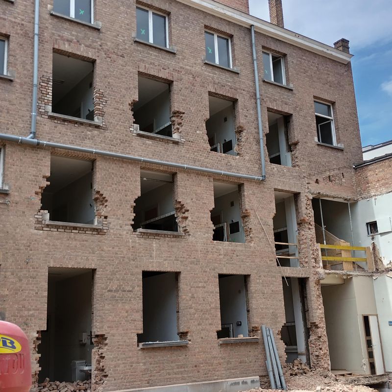 De afbraakwerken gebeuren selectief: kwalitatieve herbruikbare materialen uit de sloop worden ingezet in het nieuwe gebouw. Zo werd er voor gekozen om de imposante blauwsteen tegels (of dallen) van 1.2 op 1.2 meter uit de vroegere exporuimte aan de Hazelaarsstraat te verwijderen en zorgvuldig te stockeren om binnenkort te hergebruiken in een dakterras met openluchttheater boven op het nieuwbouwgedeelte.