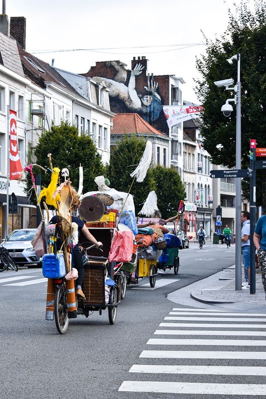 Midden september trok de karavaan van Ballet Dommage langs de Leie van Menen naar Kortrijk om via Harelbeke en Waregem in Deinze te eindigen. Samen met 15 figuranten uit onze contreien speelden ze zaterdag 11 september de première in Menen (foto's Stad Kortrijk - Jonas Verbeke). Op donderdag 16 september arriveerden ze in Kortrijk en brachten ze de stad tot leven met tal van interventies. Vrijdag 17 september kon je om 19u30 in V-tex gebouw de voorstelling in Kortrijk zien. (foto's Lies Deschietere)