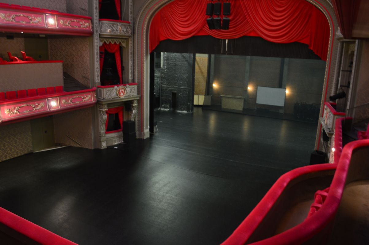 De stoeltjes (van de parterre) werden zorgvuldig uitgehaald en gestockeerd in onze kelder en de volledige Schouwburgvloer werd door middel van stellingen en planken omgetoverd tot een vlakke balzaal.