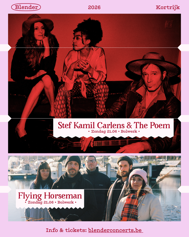 Deze zomer brengt Blender twee uitzonderlijke muzikale universums samen: Stef Kamil Carlens & The Poem en Flying Horseman. Verwacht een avond die subtiel laveert tussen intieme, literair doordrenkte samenzang en gelaagde, vurige rock die je meezuigt in een donker-kosmisch landschap. Stef Kamil Carlens & The Poem ontroeren met pure, minimalistische schoonheid, terwijl Flying Horseman de spanning opdrijft met hun intense, bezwerende sound. Een zomeravond die je nog lang met je meedraagt.