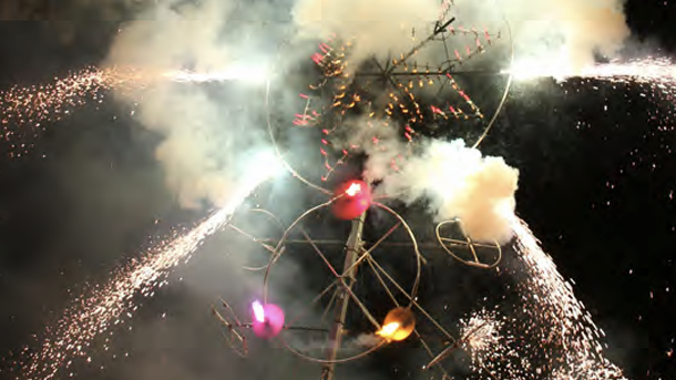 Aan de voet van de grote pyrotechnische toren sluiten de Castillos hun grootse feest af. Een spectaculaire finale met psychedelische kleuren die je versteld doen staan.