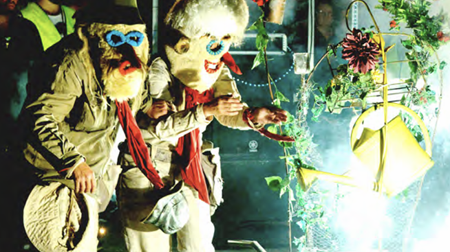Op de Kasteelkaai houdt de parade halt voor de eerste episode in hun reis. Zon, sterren en kometen in beweging voor het grote ballet van de kosmos.