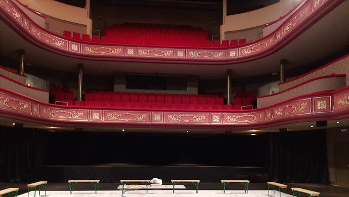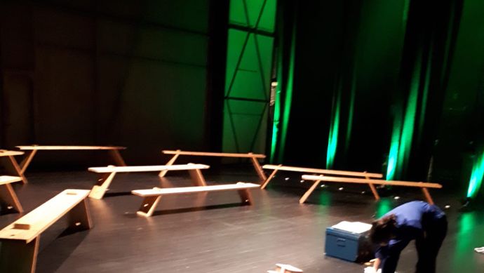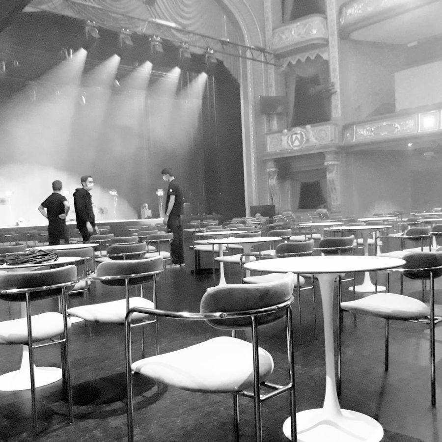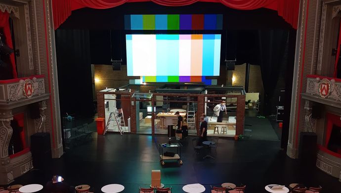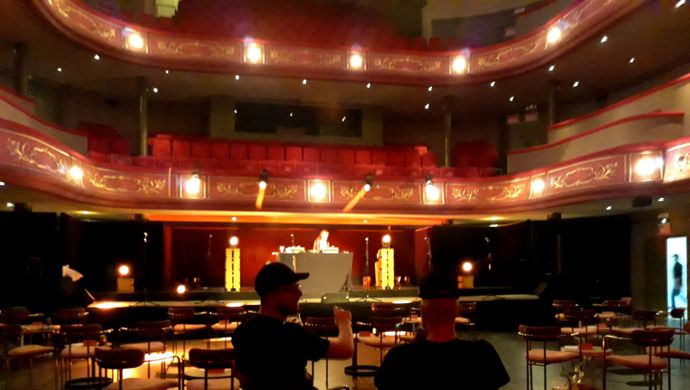De stoeltjes (van de parterre) werden zorgvuldig uitgehaald en gestockeerd in onze kelder en de volledige Schouwburgvloer werd door middel van stellingen en planken omgetoverd tot een vlakke balzaal.