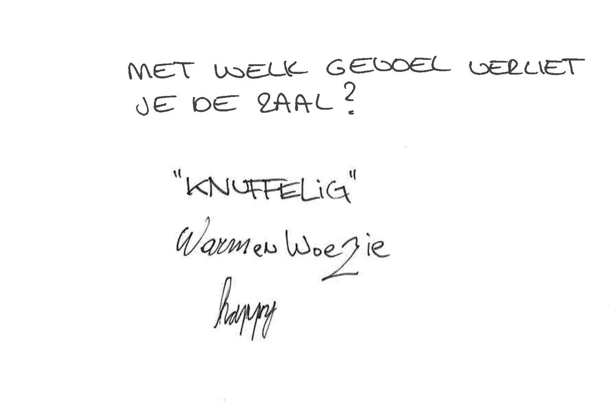 - Met welk gevoel verliet je de zaal?